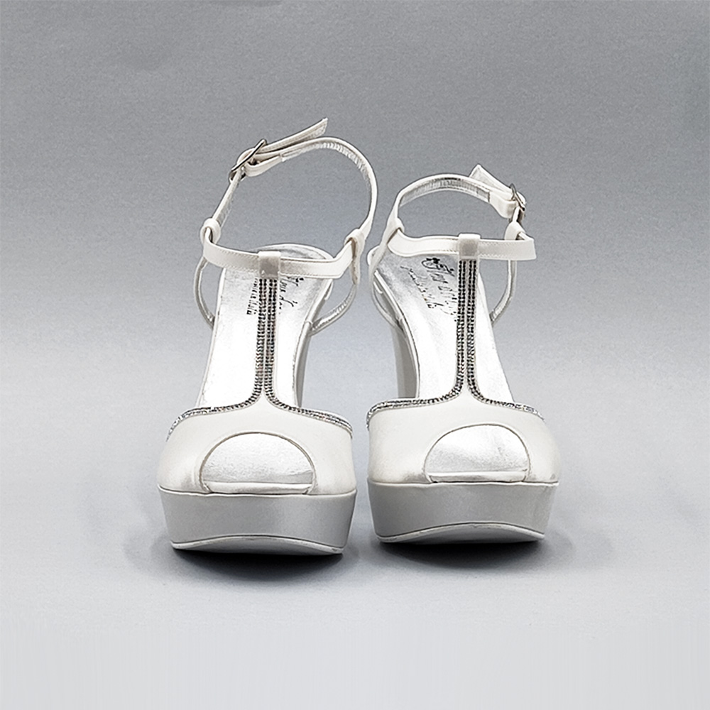 Questo sandalo da sposa di colore bianco seta presenta un disegno a T, realizzato per abbracciare al meglio il piede tenendolo ben saldo, arricchito da un applicazione di Swarovski Crystal, che dona un importante luminosità!